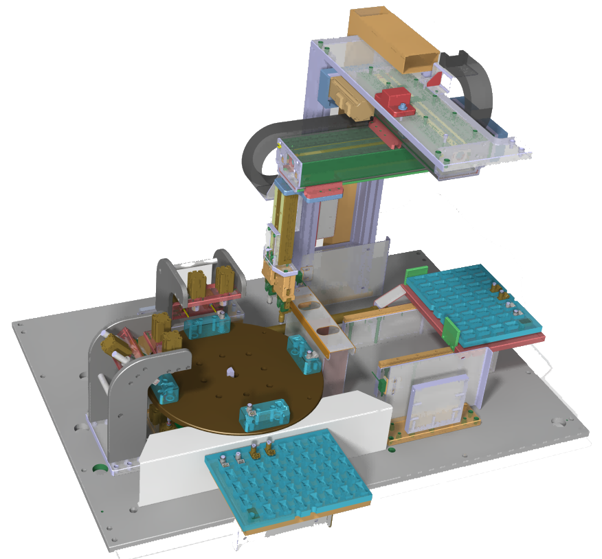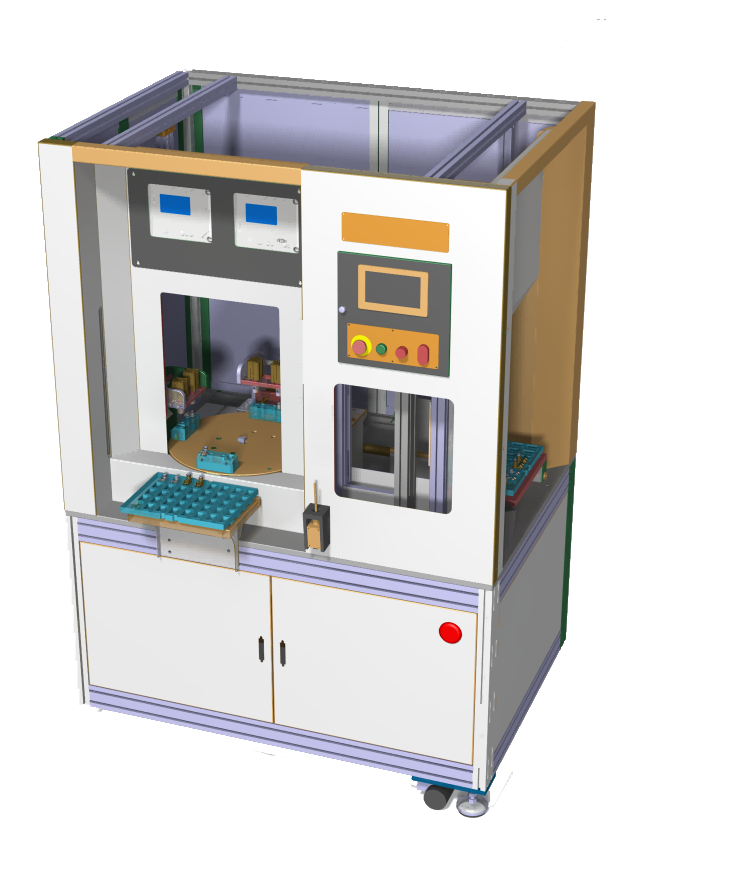The arrangement of parts is done automatically, its control system is motion control. If the pallet is full, the machine stops and a new pallet is replaced.